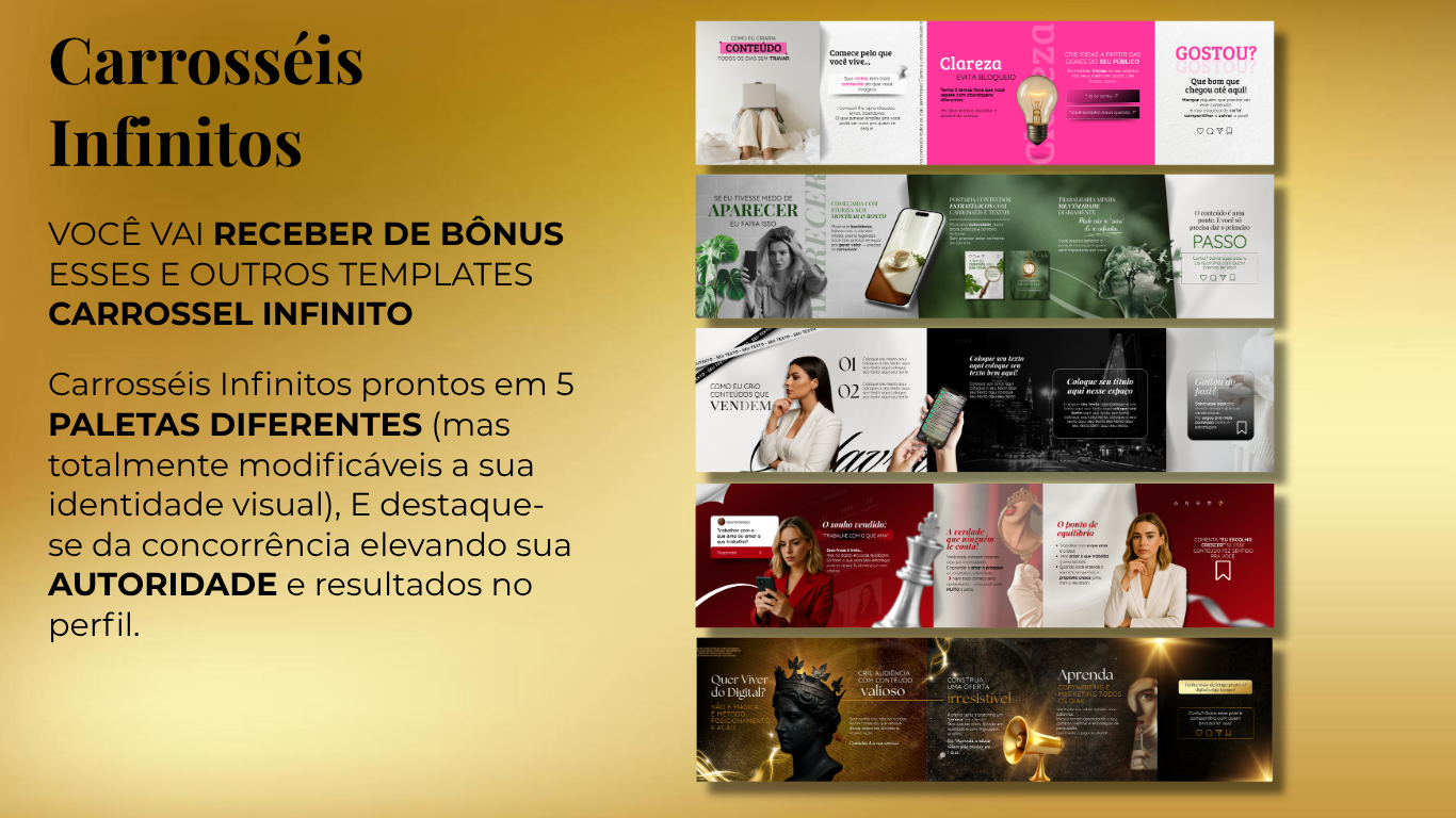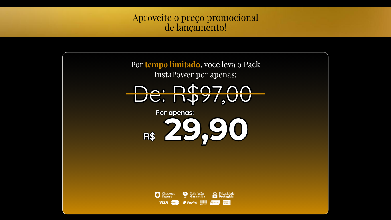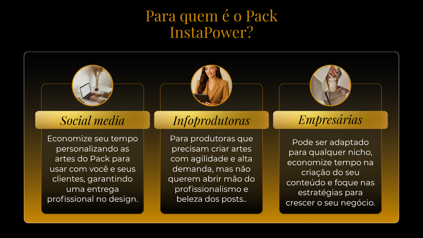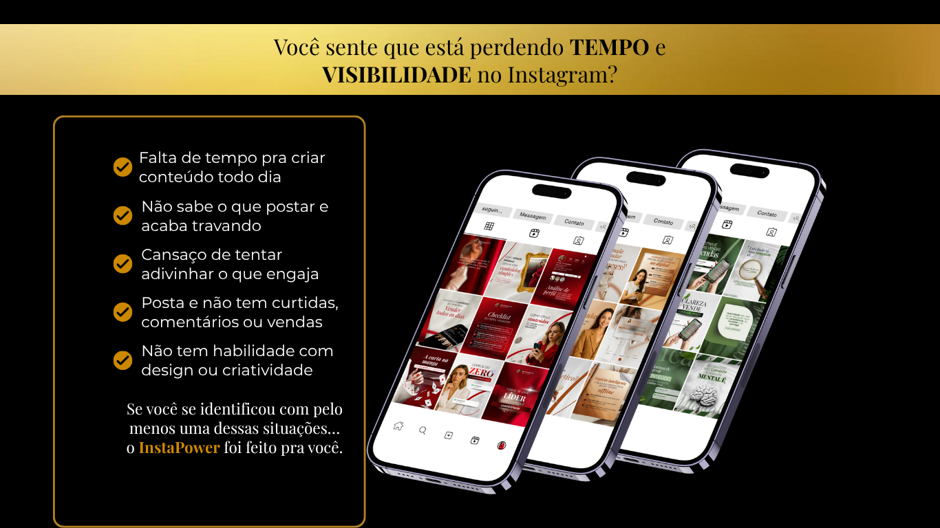Chega de travar no conteúdo! Crie posts incríveis em minutos com o combo Pack InstaPower. Artes prontas, textos estratégicos e bônus exclusivos para você se destacar no Instagram e atrair clientes todos os dias — mesmo que não saiba nada de design.